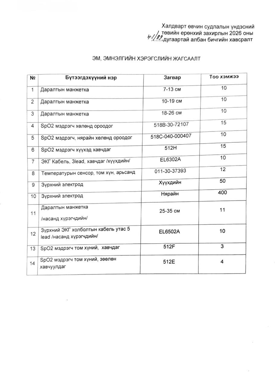 ХАЛДВАРТ ӨВЧИН СУДЛАЛЫН ҮНДЭСНИЙ ТӨВ-ИЙН НЭГДСЭН ЛАБОРАТОРИЙН АЛБА 4 ДЭХ УДААГАА ИТГЭМЖЛЭГДЛЭЭ2 сар 16. 18:34ТӨРӨЛЖСӨН МЭРГЭШЛИЙН ТӨВ ЭМНЭЛЭГ, ТУСГАЙ МЭРГЭЖЛИЙН ТӨВ, АЙМАГ НИЙСЛЭЛИЙН ЭРҮҮЛ МЭНДИЙН ГАЗАР, БОЭТ, НЭГДСЭН ЭМНЭЛГҮҮД, МЯЭ, ШШҮХ, АШУҮИС, АЧ АНАГААХ УХААНЫ ИХ СУРГУУЛЬ, ЭТҮГЭН ИХ СУРГУУЛЬ, ШИНЭ АНАГААХ УХААНЫ ИХ СУРГУУЛЬ, ХУВИЙН ХЭВШЛИЙН ЭМНЭЛЭГ, ЛАБОРАТОРИУДЫН ДАРГА НАРТ-Д2 сар 16. 15:33🌙 Цагаан сарын үеэр улаанбурханаас сэргийлэх зөвлөмж 🛡2 сар 16. 14:08“ДОХ, Сүрьеэтэй тэмцэх, сэргийлэх үндэсний хөтөлбөрийн үнэлгээ”-ний зохицуулагч сонгон шалгаруулалтад урьж байна.2 сар 16. 8:50“ДОХ, Сүрьеэтэй тэмцэх, сэргийлэх үндэсний хөтөлбөрийн үнэлгээ”-ний зөвлөх нарын сонгон шалгаруулалтад урьж байна.2 сар 13. 16:50