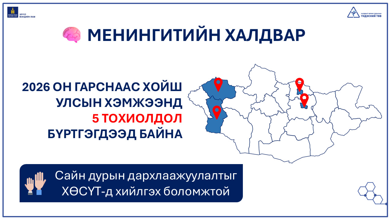 Монгол Улсын хэмжээнд 2026 оны 3 дугаар сарын 05-ны өдрийн байдлаар менингококкт халдварын батлагдсан 5 тохиолдол (УБ-2, ДА-1, ХО-1, УВ-1), сэжигтэй 1 (УБ) тохиолдол бүртгэгдэж, 1 тохиолдол нас барсан байна. Насны хувьд 6 сартайгаас 10 насны хүүхдийн дунд бүртгэгдэж, 66,7% нь 5 хүртэлх насны хүүхдүүд байна.