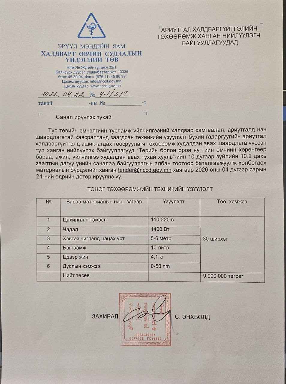Ариутгал халдваргүйтгэлийн төхөөрөмж ханган нийлүүлэгч байгууллагуудад